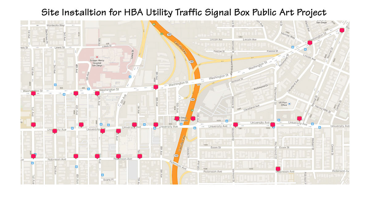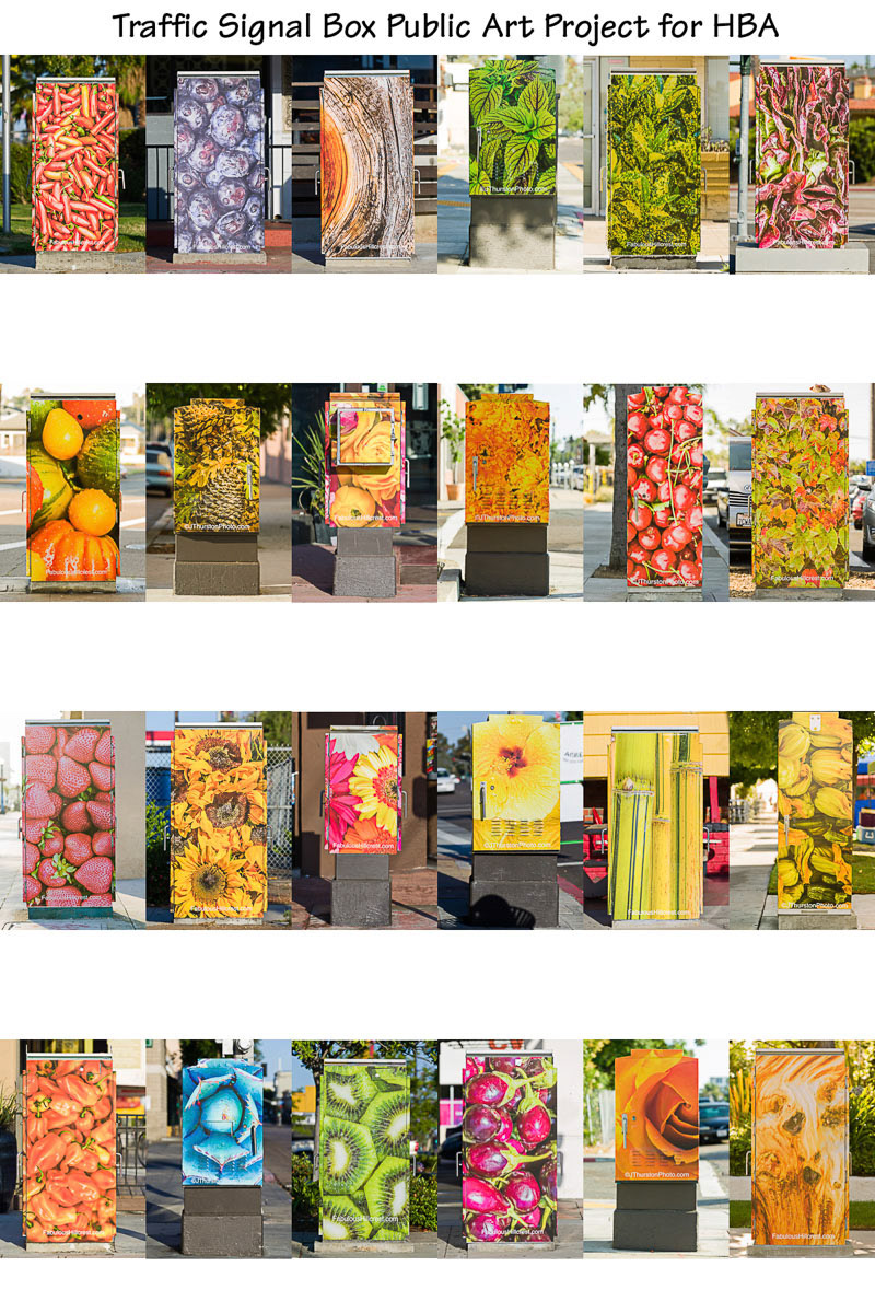Public Artwork commissioned by the Hillcrest Business Association to wrap 24 Traffic Light Utility Boxes with Vinyl Printed imagery shot for the Installation.